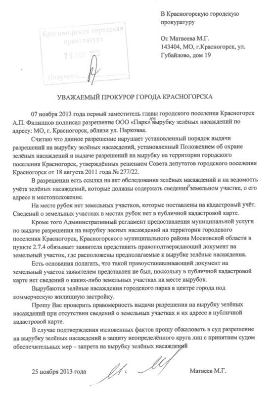 20 марта 2014 года я получил постановление об отказе в возбуждении уголовного дела по моему заявлению о незаконности выдачи разрешения от 07 ноября 2013 года № 44 первым заместителем главы городского поселения Красногорск А.П. Филипповым на вырубку зелёных насаждений по адресу: МО, г. Красногорск, вблизи ул. Парковая (приложение 1).