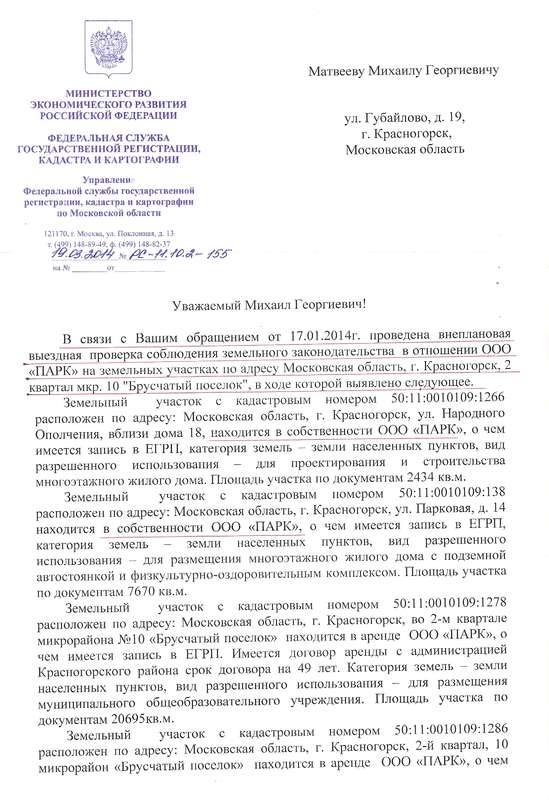 Моё обращение в Росреестр от 17 января 2014 года о законности использования ООО «Парка» земельных участков лесопарка № 50:11:0010109:1276 и № 50:11:0010109:1286 осталось без ответа.