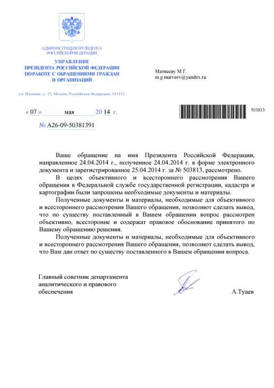 Поскольку в ответах нет даты регистрации права ООО Парк на земельные участки и нет сведений о земельном участке 1276, то обратился вновь к Президенту России с той же просьбой.